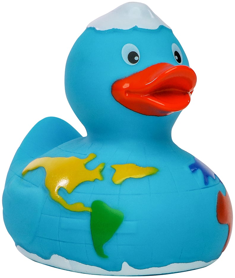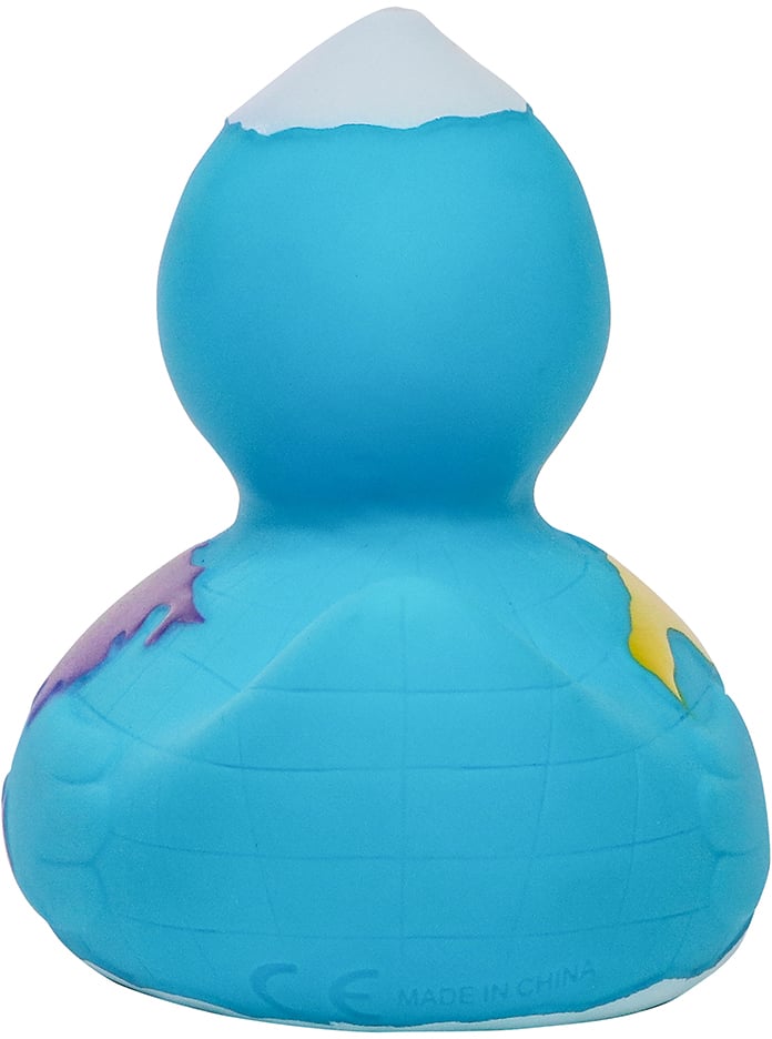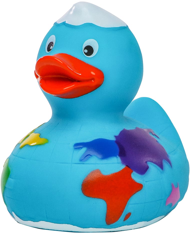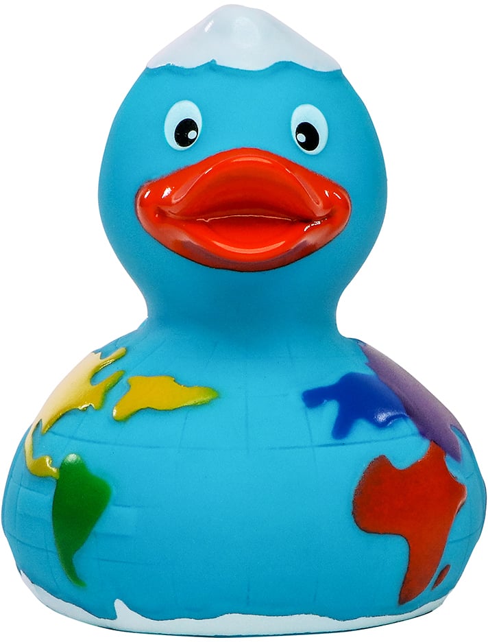 Die ganze Welt auf einer Ente. Der fröhliche Badezimmer-Bewohner hat auf leuchtendem Ozeanblau alle Kontinente erhaben abgebildet. Der Nordpol sitzt wie ein keckes Hütchen auf dem Kopf und der Südpol umrundet das Entlein am unteren Rand.