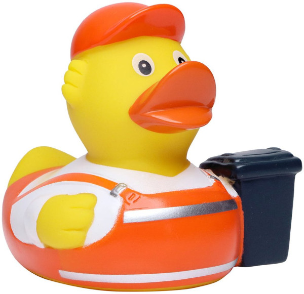 Quietsche-Ente Müllmann sorgt zumindest visuell für Ordnung im Alltag. Charmant macht er seinen Job und bringt ganz nebenbei noch 8 cm geballte Power und Geschmacksmusterschutz mit. Bis ins Detail schlüpft dieses Schnabels® Exemplar in das bekannte Müllmann-Outfit und bringt sorgar eine kleine Mülltonne mit.