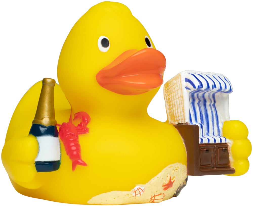Dieses glückliche Entlein weiß wie man es sich gut gehen lässt. Und vor allem WO! Der kleine Druck auf dem Bürzel verrät ihr Ziel sowie das der zahlreichen schicken Autos auf dem Weg Richtung Norden. Sylt ist der Inbegriff für mondänen Urlaub im Norden Deutschlands. Gemütlich in einen Strandkorb gekuschelt lässt sich der Sand und die Nordsee genießen. Apropos genießen: Hummer und Champagner dürfen natürlich nicht fehlen. So ausgestattet steht Genuss und Erholung nichts mehr im Wege.