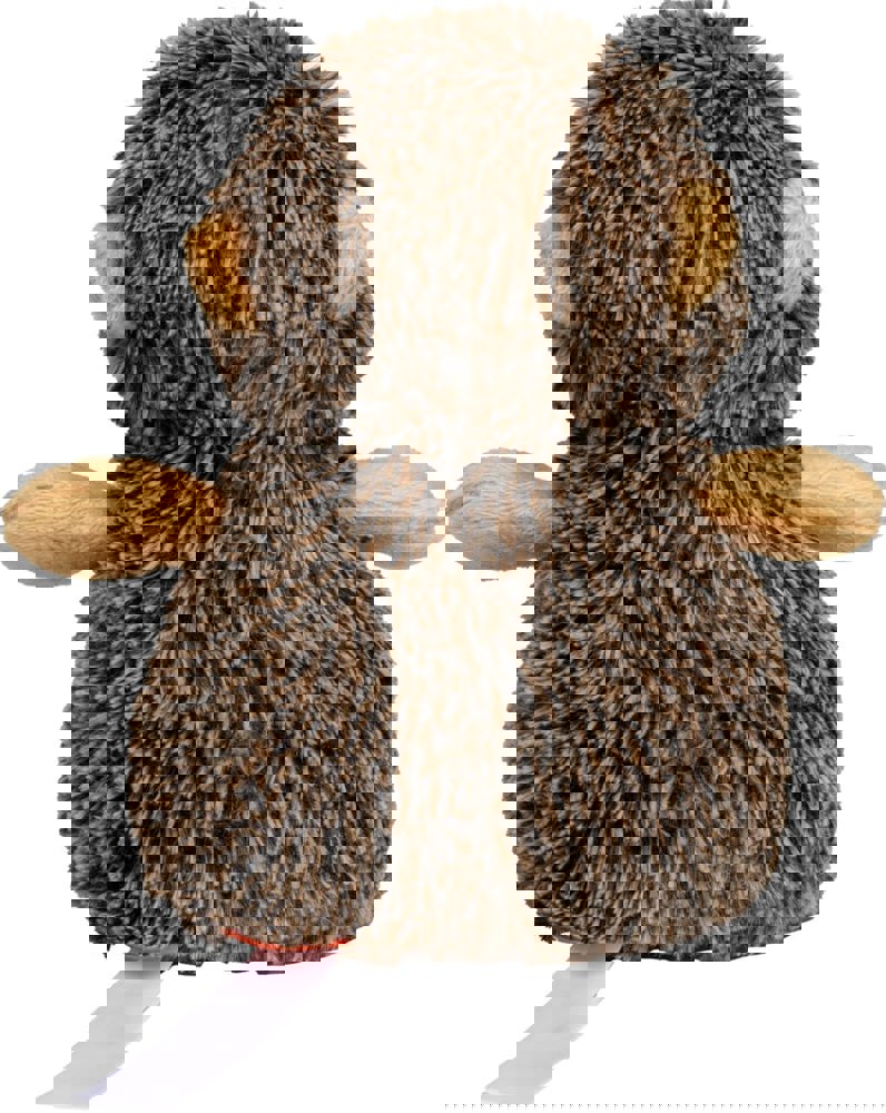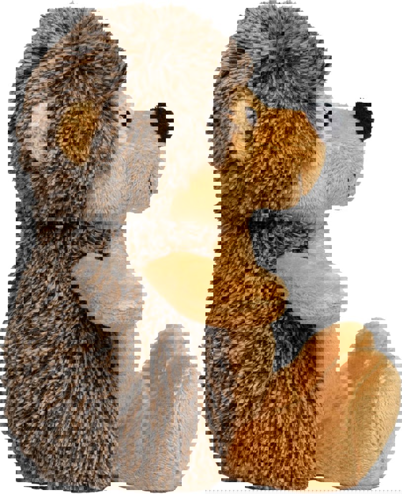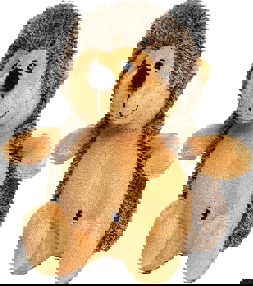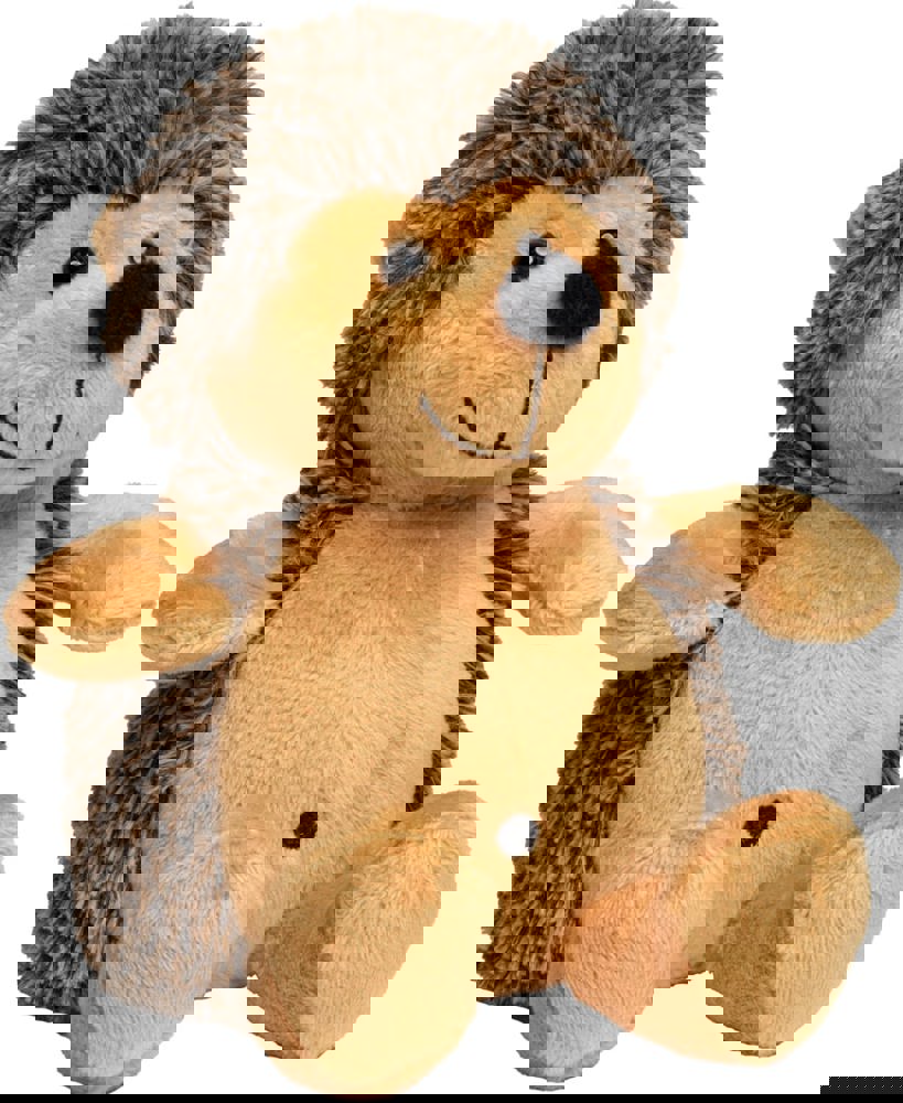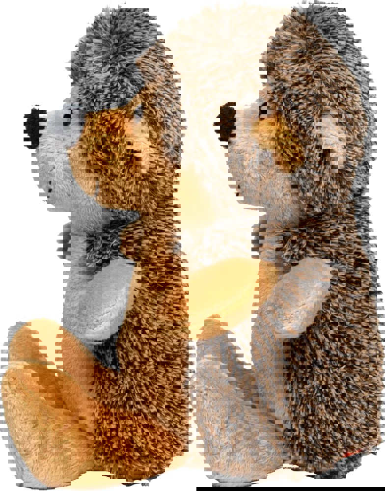 Unser Carsten rollt sich nicht zusammen, denn er hat keine Angst vor Kuscheleinheiten. Eigentlich haben Igel ja nur am Bauch und Gesicht Haare, rund um die immer feuchte Nase (die bei Carsten äußerst prägnant ist), um die dunklen Knopfaugen und um die Ohren herum, der Rest ist stachelig. Aber seine Stacheln tun natürlich nur so als ob: Langer Plüsch in zwei Farben sorgt durch die Melierung für den „Stachel-Look“.