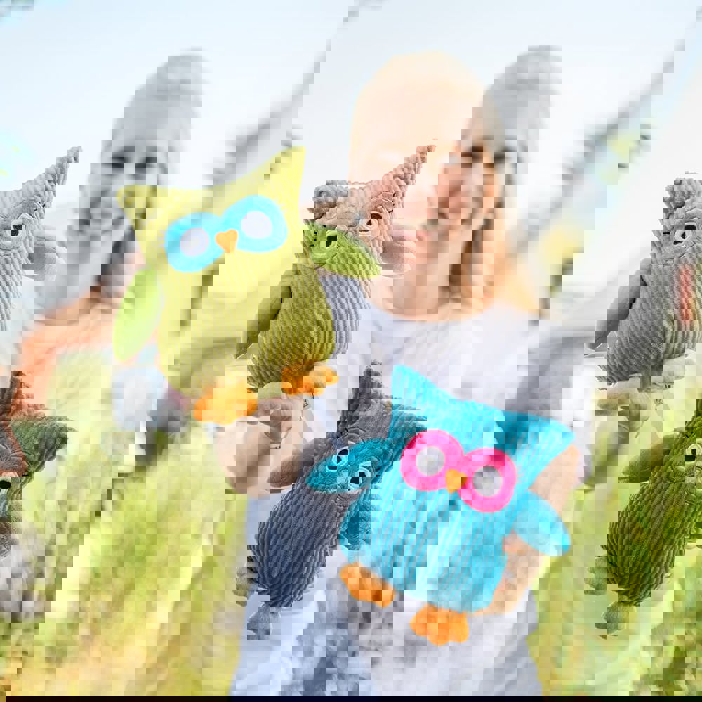 Im farbenfrohen Federkleid kommt die Eule angeflattert. Die leuchtende Farbe strahlt mit ihren großen Augen um die Wette. Das trendige Cordmaterial verleiht dem Nachtschwärmer ein besonders modisches Aussehen.