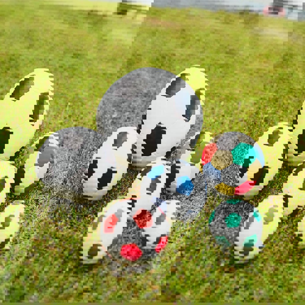 Unsere Softbälle in Fußballoptik gibt es in verschiedenen Größen und unterschiedlichen Farben. Die 6-Ecke sind dabei immer weiß und die 5-Ecke immer in der ausgesuchten Farbe. Sie verfügen stets über ausreichend Platz für die Werbeanbringung. Für Ballkünstler und die, die es noch werden wollen, egal in welchem Alter. Mit Platz für die Werbeanbringung.