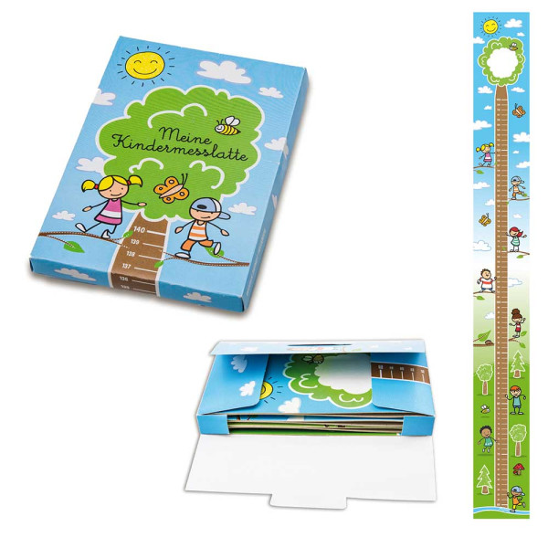 Mit der Kindermesslatte aus bunt bedrucktem Karton können Eltern auf eine einfache Weise das Wachstum ihrer Kinder dokumentieren. Der Messbereich reicht von 60 bis 140 cm und bietet somit eine lange Nutzbarkeit. Die Messlatte ist im handlichen DIN A6-Format gefaltet und lässt sich praktisch verstauen. Das Set wird in einer hochwertig gestalteten Mappe geliefert.