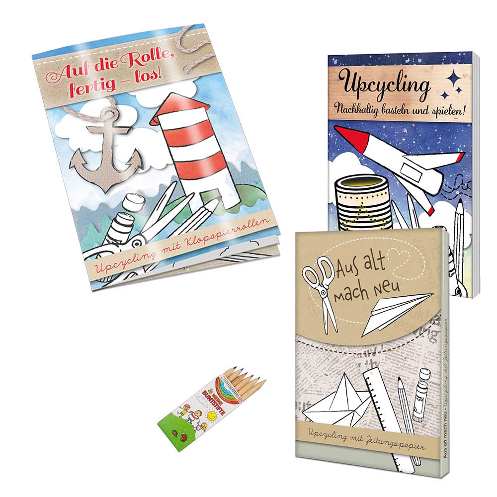 Mit unseren Upcycling-Sets lernen Groß und Klein, wie aus alten Dingen neue, kreative Schätze entstehen. Das 20-seitige Heft bietet liebevoll gestaltete Illustrationen und einfache Bastelanleitungen, die den Gedanken der Wiederverwendung fördern und zur Kreativität anregen. Die Sets enthalten zusätzlich eine praktische 6er-Buntstiftbox in einer ansprechend gestalteten Kartonverpackung. Geliefert wird das Set in einer hochwertigen, buchförmigen Mappe.