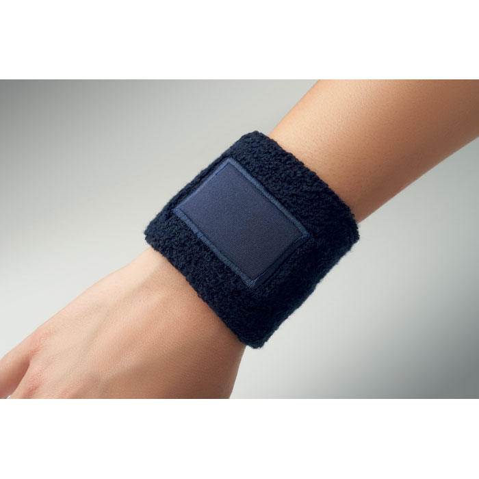 Schweißarmband aus Polycotton (79% Baumwolle/ 13% Elasthan/ 8% Polyester) mit Baumwollpatch.