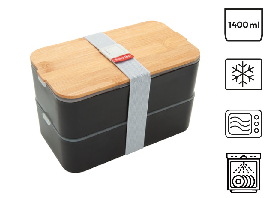 Lunchbox mit doppeltem Fach. Zwei Behälter aus Polypropylen und zwei Trennwände aus Polyethylen mit Silikondichtungen und Vakuumverschlusssystem für perfekte Abdichtung. Deckel aus Bambus. Kompatibel (ohne Deckel) mit Spülmaschine (max. 50 °C), Gefrierschrank und Mikrowelle (max. 100 °C und 2 Minuten). Fassungsvermögen: 1,4 Liter.