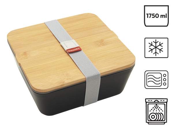 Lunchbox mit einem Fach. Behälter aus Polypropylen und Trennwand aus Polyethylen mit Silikondichtungen und Vakuumverschlusssystem für perfekte Abdichtung. Unterteiler Einsatz aus Polypropylen. Deckel aus Bambus. Kompatibel (ohne Deckel) mit Spülmaschine (max. 50 °C), Gefrierschrank und Mikrowelle (max. 100° C und 2 Minuten). Fassungsvermögen: 1,75 Liter.