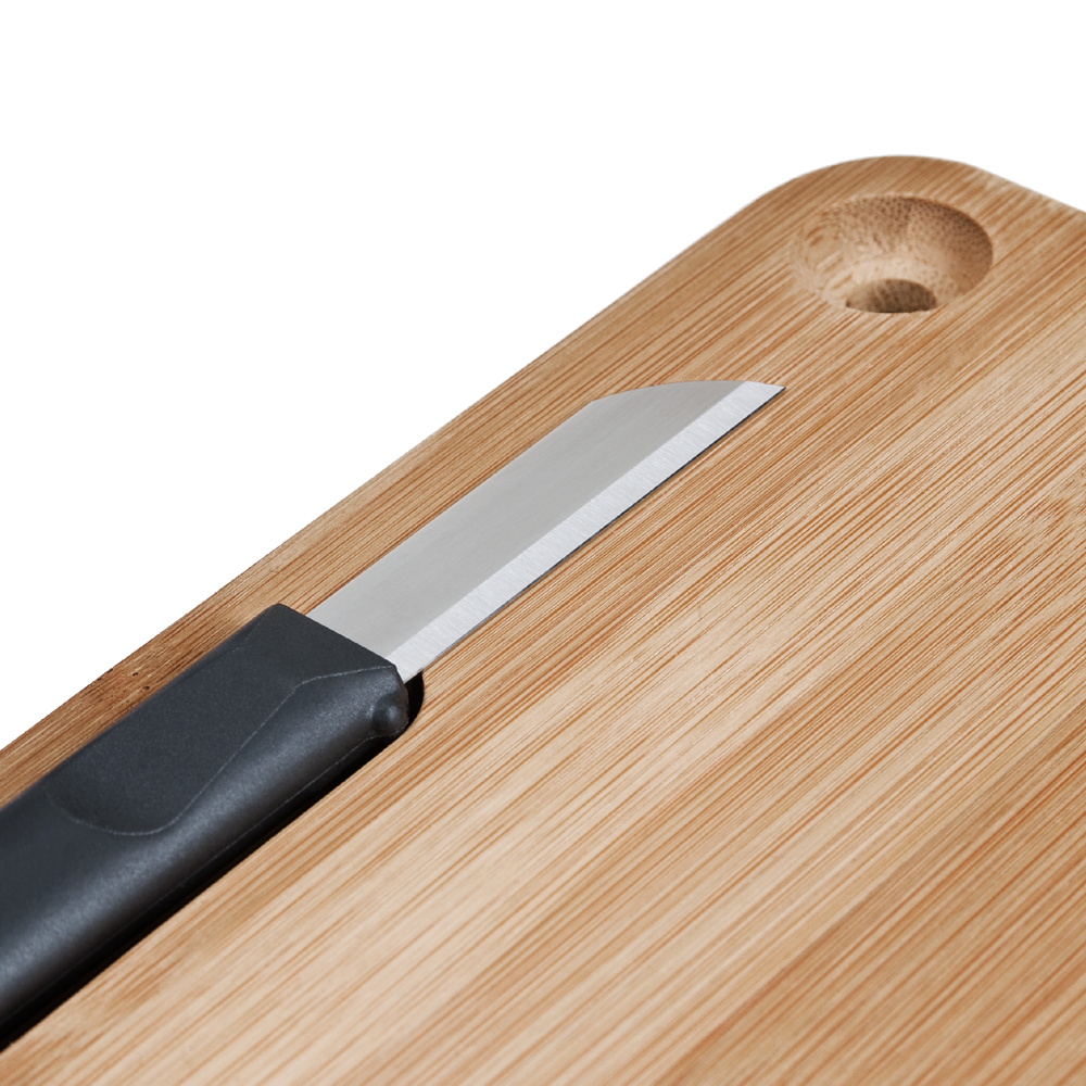 Das Messer wird magnetisch in der Griffmulde des Bambusbretts gehalten – ein echter Hingucker der durch die lange und häufige Nutzung dauerhaften Werbeerfolg garantiert.