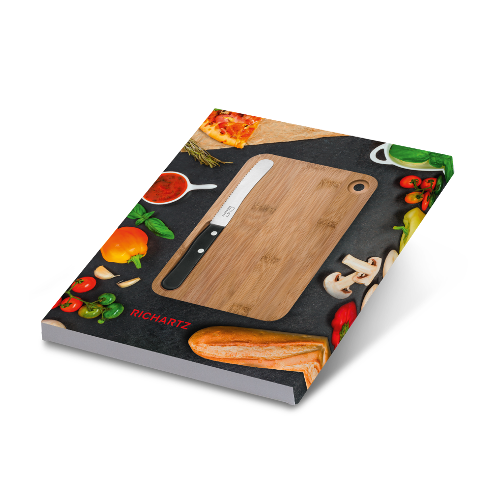 Das Messer wird magnetisch in der Griffmulde des Bambusbretts gehalten – ein echter Hingucker der durch die lange und häufige Nutzung dauerhaften Werbeerfolg garantiert.