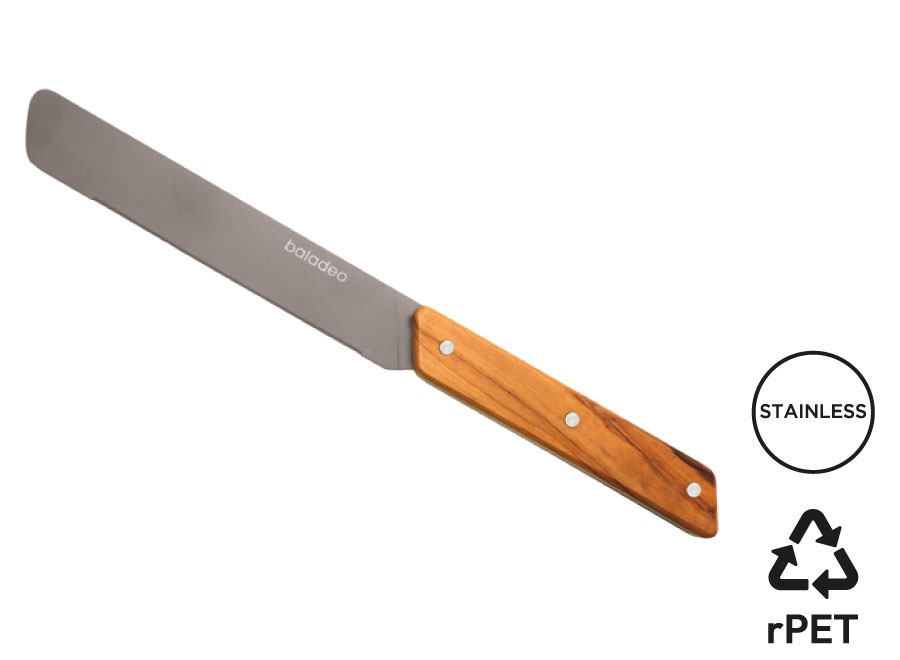 Streich- und Brotzeitmesser mit Klinge aus 420er Edelstahl für den Lebensmittelgebrauch (martensitischer Stahl gemäß EN10088-2 2005) und Titan-Finish. Teils mit Mikroverzahnung. Griff aus Olivenholz. Auch als Buttermesser bezeichnet. Wird in einem grau melierten Etui aus RPET geliefert.