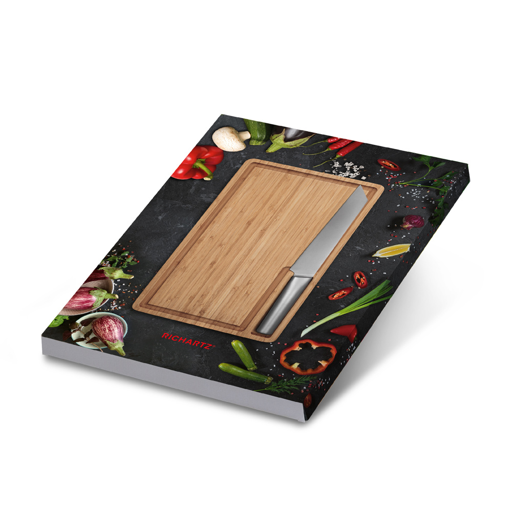 RICHARTZ CHEF de cuisine ist der erfolgreiche Werbeträger für Marken und Unternehmen. Mit einer individuellen Klingen- / Holzgravur und individuell gestalteter 4-seitigen Verpackung in 4c, werben Marken aufmerksamkeitsstark und aussagekräftig!