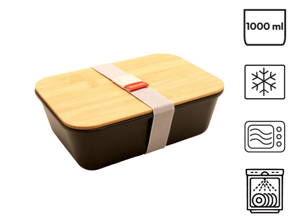 Lunchbox mit einem Fach. Behälter aus Polypropylen. Bambusdeckel mit Silikondichtungen für eine bessere Abdichtung. Kompatibel (ohne Deckel) mit Spülmaschine (max. 50 °C), Gefrierschrank und Mikrowelle (ohne Deckel, max. 100° C und 2 Minuten). Fassungsvermögen: 1 l.