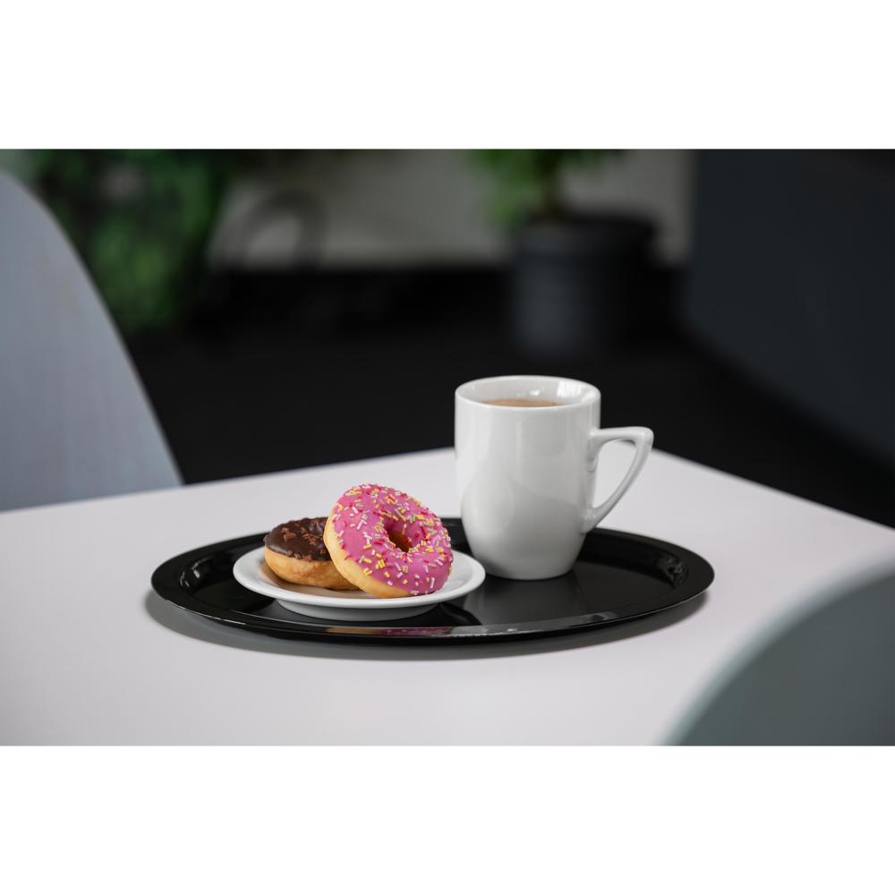 Ovales Tablett aus stabilem Kunststoff mit großer Werbefläche und niedrigem Rand zur besseren Handhabung. Besonders geeignet zum Servieren von Kaffee oder Tee.