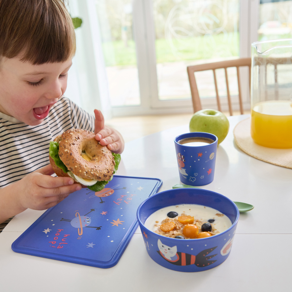 Das kleine Brettchen mit dem zauberhaften Motiv verbreitet viel gute Laune auf dem Frühstückstisch und animiert Kleinkinder spielerisch zu eigenständigen Essen. Ob Marmeladenbrot, frisches Obst oder kleine Snacks, CONNECT BOARD SPACE bietet allen Leckereien eine ideale Grundlage. Es besteht aus extra stabilem, bruchsicherem Material und ist natürlich spülmaschinengeeignet. Der nachhaltige Markenartikel – made in Germany. Für unsere Kollektion verwenden wir vorwiegend biozirkuläre Kunststoffe, die aus gebrauchten Speiseölen recycelt werden.