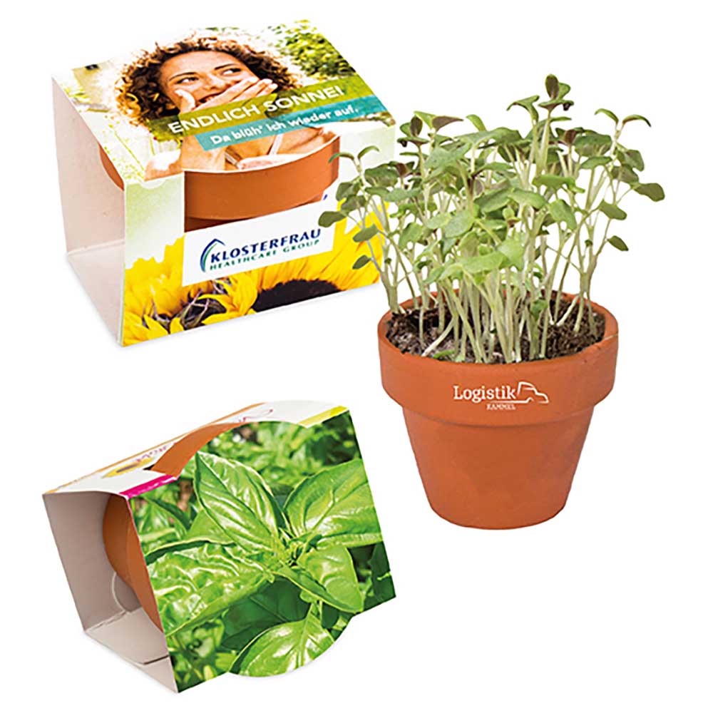 Logo-Töpfchen Komplettbanderole mit Samen - Basilikum