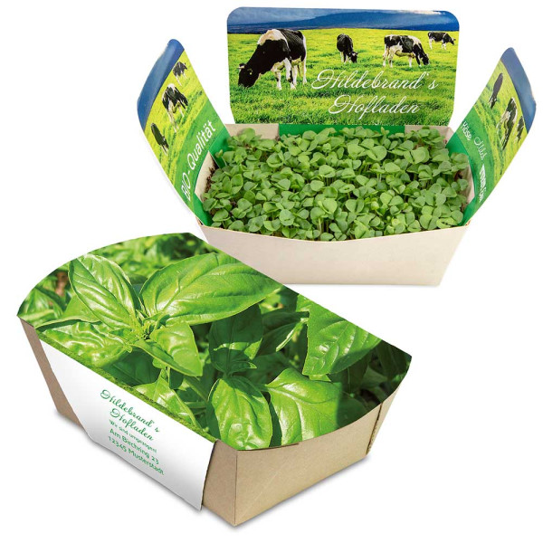 Eventcharakter in Miniaturformat bietet das Pflanzodrom. Mit dem Wortteil „drom“ verbindet man große Stadien, Hallen, Gebäude und Veranstaltungen. Und genau dafür ist das Mini-Gärtchen gemacht: Mit aufgesteckten, thematisch passenden Seitenteilen entsteht beispielsweise ein Fußball- oder Sportstadion, ein Bauernhof, ein Osternest, ein Ausmalbild für Kinder oder viele weitere Gebäude und Behältnisse, die passend zur Marke, einer Veranstaltung oder einem saisonalen Thema gestaltet werden können. Außerdem wird ein weiterer Trend fokussiert: Gesunde Lebensmittel stehen im Blickpunkt der Kunden. In der Schale aus Bambuspapier können Kresse, Basilikum, Kräutermischung oder Gewürzpaprika angebaut werden. Aber ebenso Gras, Sonnenblumen und weitere Samen nach Wahl. Geliefert wird das Pflanzodrom mit einer Substrattablette als Erde und einer Samentüte. Unter der rundum individuell bedruckten Banderole liegen die individuell gestaltbaren Steckteile parat und transportieren perfekt die grüne Werbebotschaft.