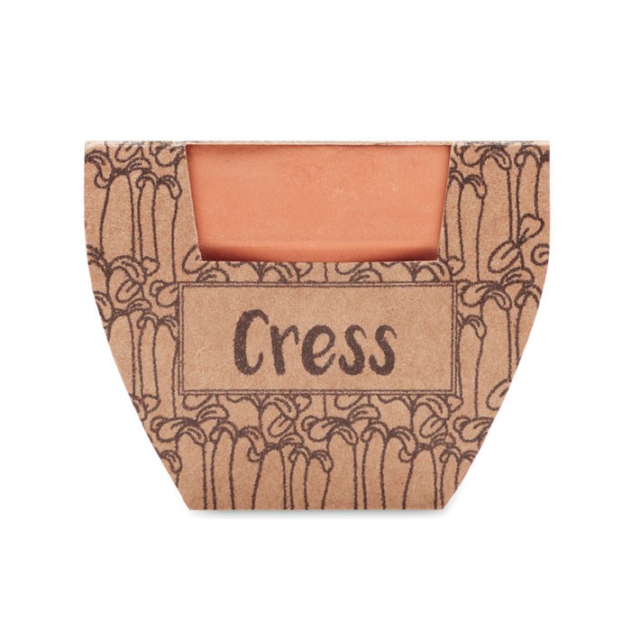 Kleiner Terrakotta-Topf aus Ton mit ''''Kresse''''-Samen. Inklusive Substrattablette. Hergestellt in der EU.