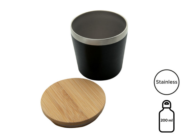 Doppelwandiger Isolierbecher aus rostfreiem 18/8 Edelstahl. Deckel aus Bambus mit Silikondichtung. Fassungsvermögen: 200 ml.
