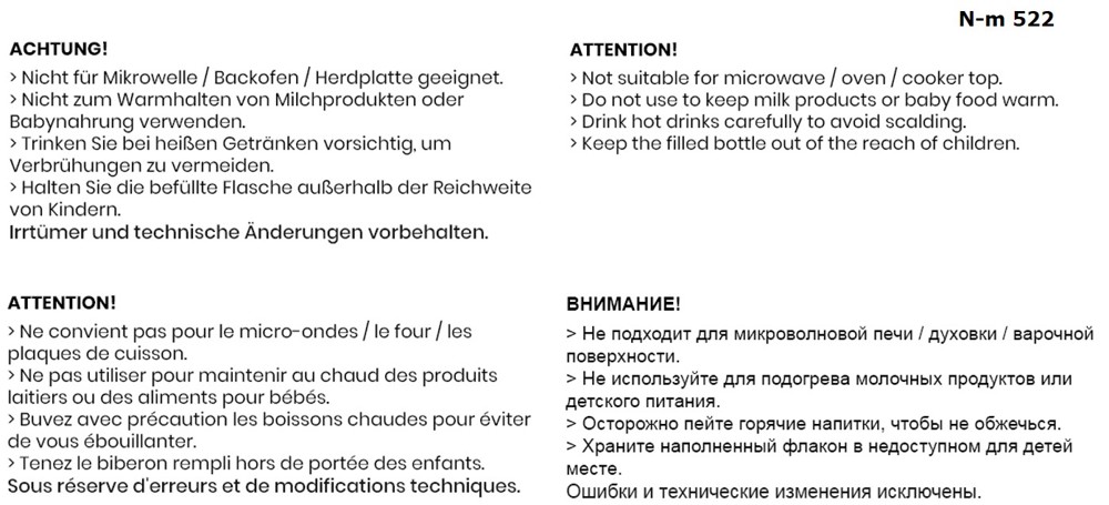 | Veredelung Infotext: | auf dem Deckel 20 x 10 mm (D2); hochkant auf dem Flaschenkorpus 60 x 30 mm (D2); hochkant auf dem Flaschenkorpus 60 x 12 mm (L2); 3D Gravur, 55 x 60 mm max. (3DL4); UV-Direktrunddruck 360° (UVR) |