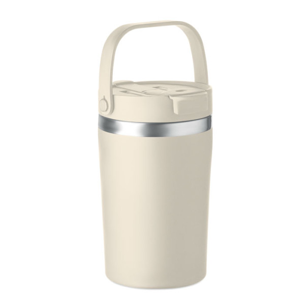 Doppelwandiger Becher aus recyceltem Edelstahl (90 % recycelter Edelstahl und 10 % Edelstahl). 2in1-Deckel aus PP mit Trinköffnung und Trinkhalm. Auslaufsicher. Füllmenge: 350 ml.