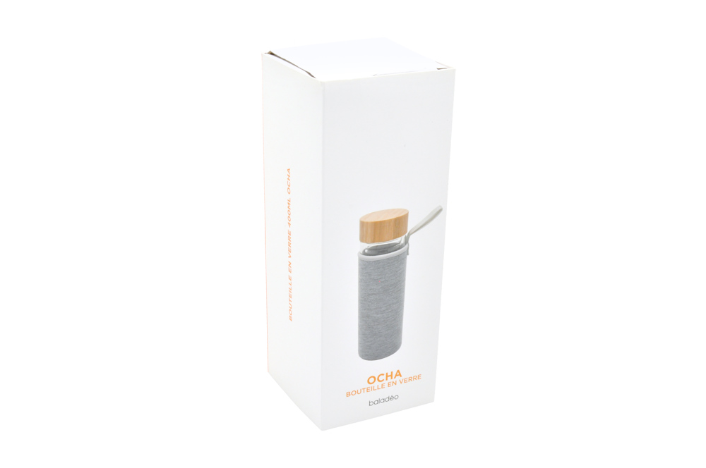 Doppelwandige Glasflasche aus Borosilikat. Verschraubter Deckel mit Bambusbeschichtung und Silikondichtung für perfekte Abdichtung. Inklusive Teefilter. Kompatibel (ohne Deckel) mit Spülmaschine. Grau melierte Neoprenhülle als Schutz. Fassungsvermögen: 400 ml.