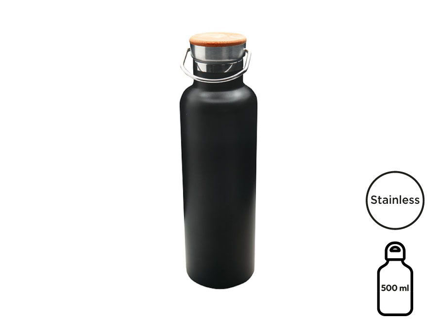 Doppelwandige Flasche 'Arima', schwarz, Bambusdeckel, 500ml