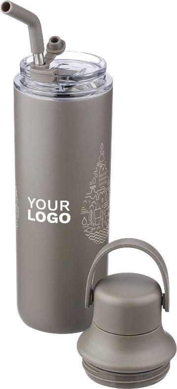 Diese doppelwandige Edelstahl-Trinkflasche (500 ml) ist innen aus Edelstahl 304 und außen aus Edelstahl 201 gefertigt. Sie wird mit zwei Deckeln geliefert: einem PP-Deckel mit Tragegriff und einem transparenten PS-Deckel zur Verwendung mit dem mitgelieferten Strohhalm aus Edelstahl mit Silikonspitze und Halterung. Die Flasche ist einzeln in einer braunen Kartonschachtel verpackt.
