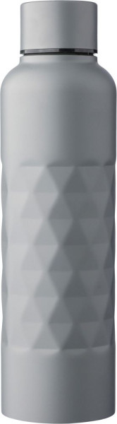 Es handelt sich um eine einwandige Trinkflasche aus recyceltem Edelstahl (800 ml) mit rautenförmiger Textur auf dem Körper, Schraubdeckel und einem lasergravierten Recycling-Logo. Sie wurde aus Edelstahl 304 hergestellt. Sie ist einzeln verpackt in einer braunen Pappschachtel.