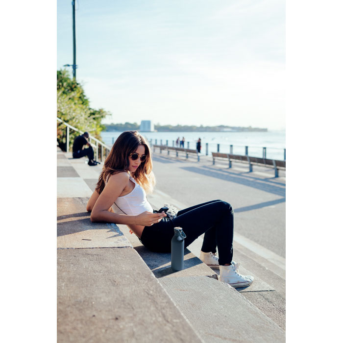 Einwandige Flasche aus 90 % recyceltem Edelstahl und 10 % Edelstahl mit gummiertem Finish. Inkl. Deckel aus PP/Edelstahl und Silikonhenkel. Füllmenge: 500 ml.