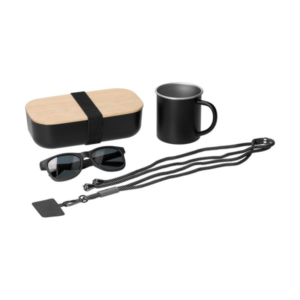 Das Onboarding Set 3 bietet einen stilvollen Start! Enthalten sind die Sonnenbrille "Beach", die Handykette "Universal", der Edelstahlbecher "Adventura" sowie die Vorratsdose "Beech". Perfekt für einen gelungenen Einstieg!