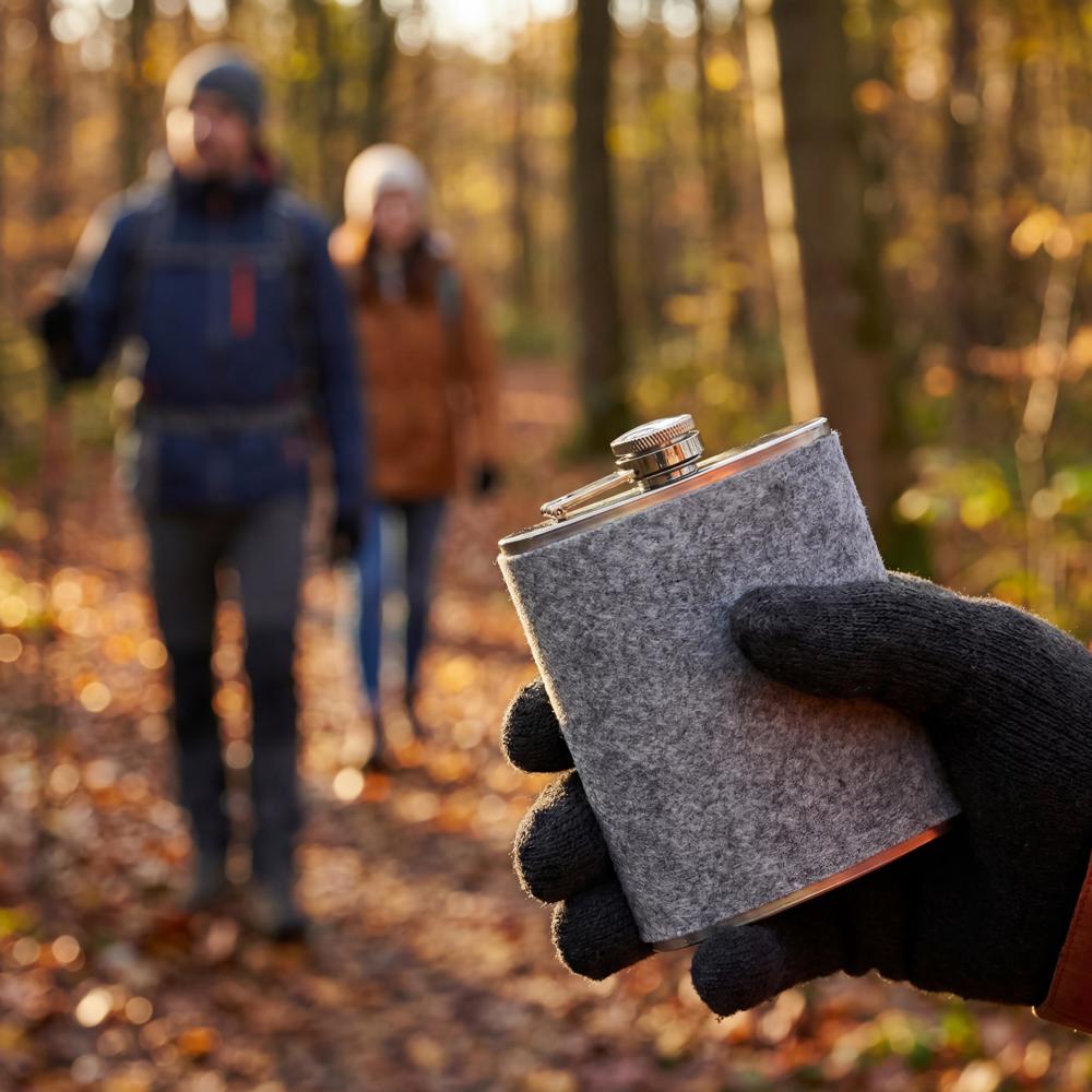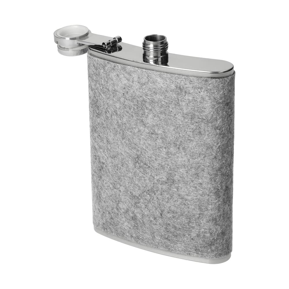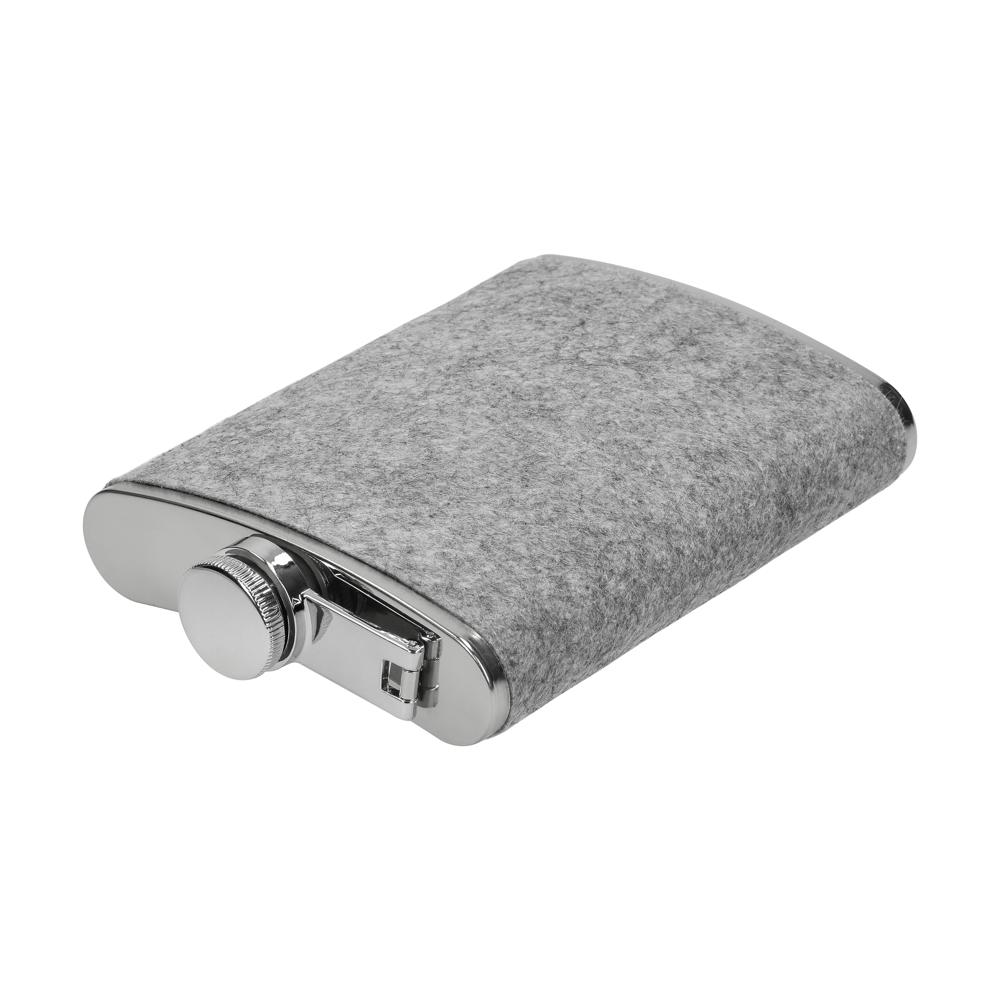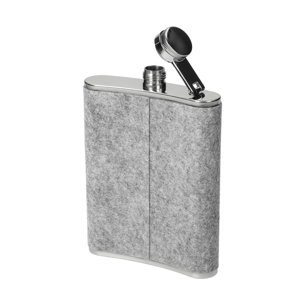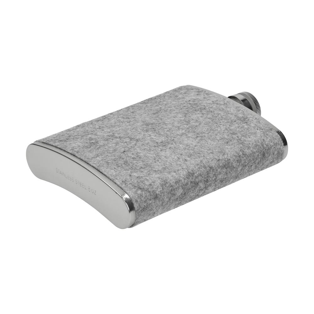 Flachmann „Feltic“ aus Edelstahl mit Filzummantelung. Kompakt, stabil und mit 230 ml Füllvolumen ideal für unterwegs. Dank schlankem Design passt er in jede Tasche und überzeugt durch robuste Verarbeitung sowie moderne Materialkombination aus Filz und Edelstahl.