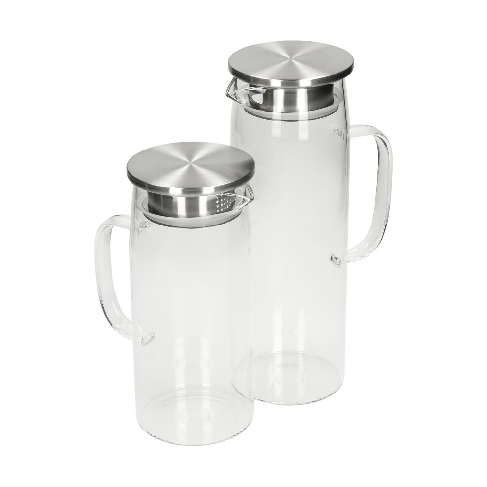 Karaffe aus Borosilikatglas mit Edelstahl- und Silikonelementen. Füllvolumen 1,5 l – perfekt für Wasser, Säfte oder Eistee. Leichte Reinigung und einfache Handhabung machen sie zum praktischen Begleiter für Alltag und Büro. Stilvolles Design trifft auf Funktionalität.