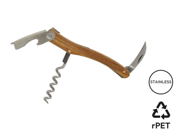 Professioneller Korkenzieher. Griff aus Zebranoholz. Spirale mit fünf Windungen aus rostfreiem Edelstahl. Mikroverzahnter Kapselschneider. Flaschenöffner. Wird in einem grauen Etui aus RPET geliefert.