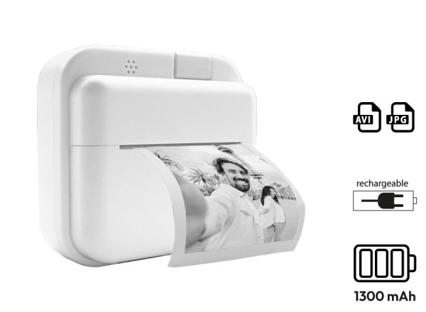 Sofortbildkamera mit ABS Gehäuse, welches das Aufnehmen von Farbfotos im JPG-Format (auflösbar zwischen 12, 20 oder 48 MP), das Aufzeichnen von Videos im AVI-Format (Auflösung 1080P) und den sofortigen Thermodruck in Schwarzweiß ohne Toner ermöglicht. Bildschirmgröße: 5 cm (2"). Funktionen: Timer (3, 5 oder 10 Sekunden) und Serienaufnahmen. 10 Filter und 10 Rahmen verfügbar. Einstellbare Frequenz: 50 oder 60 Hz. 2 Rollen Thermopapier im Lieferumfang enthalten, jede reicht für den Druck von 50 Fotos. Navigationsmenü in 15 Sprachen verfügbar, darunter Französisch, Englisch und Deutsch. 5 Minispiele. Funktioniert mit einem wiederaufladbaren 1300-mAh-Akku. Wird mit einem USB-C-Ladekabel geliefert.