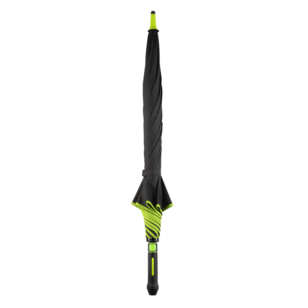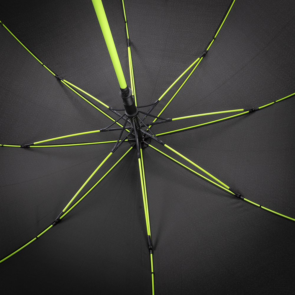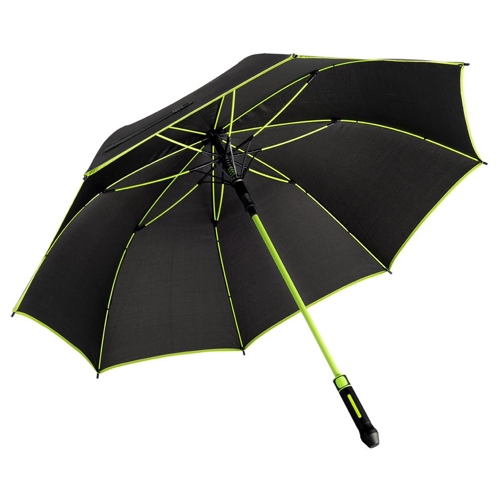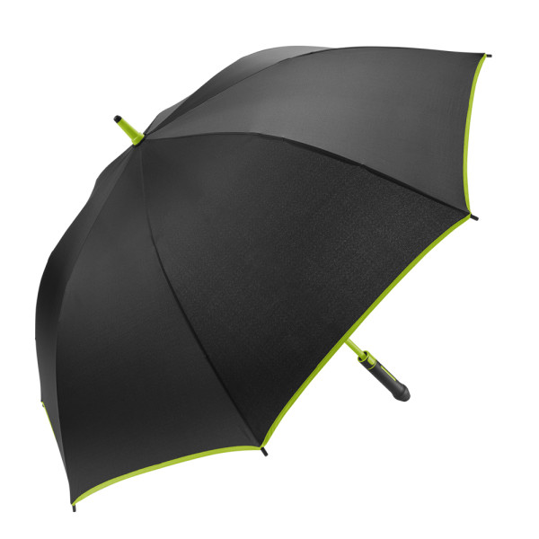 Der Regenschirm verfügt über eine Bespannung aus 190T Pongee mit farblicher Bordüre und einem Durchmesser von ca. 120 cm. Im geschlossenen Zustand ist er etwa 95 cm lang und lässt sich per Automatik öffnen. Der Schirm besteht aus 8 Segmenten und ist mit 68 cm langen Fiberglasspeichen sowie einem 14 mm Fiberglas-Schaft in der Farbe der Bespannung ausgestattet. Zudem bietet der Schirm eine Windproof-Funktion für zusätzliche Stabilität. Der schwarze, gummierte Kunststoffgriff kann mit seitlichem Doming veredelt werden und sorgt für einen komfortablen Halt.