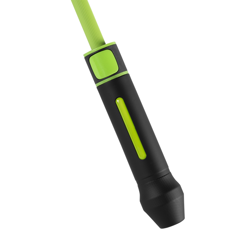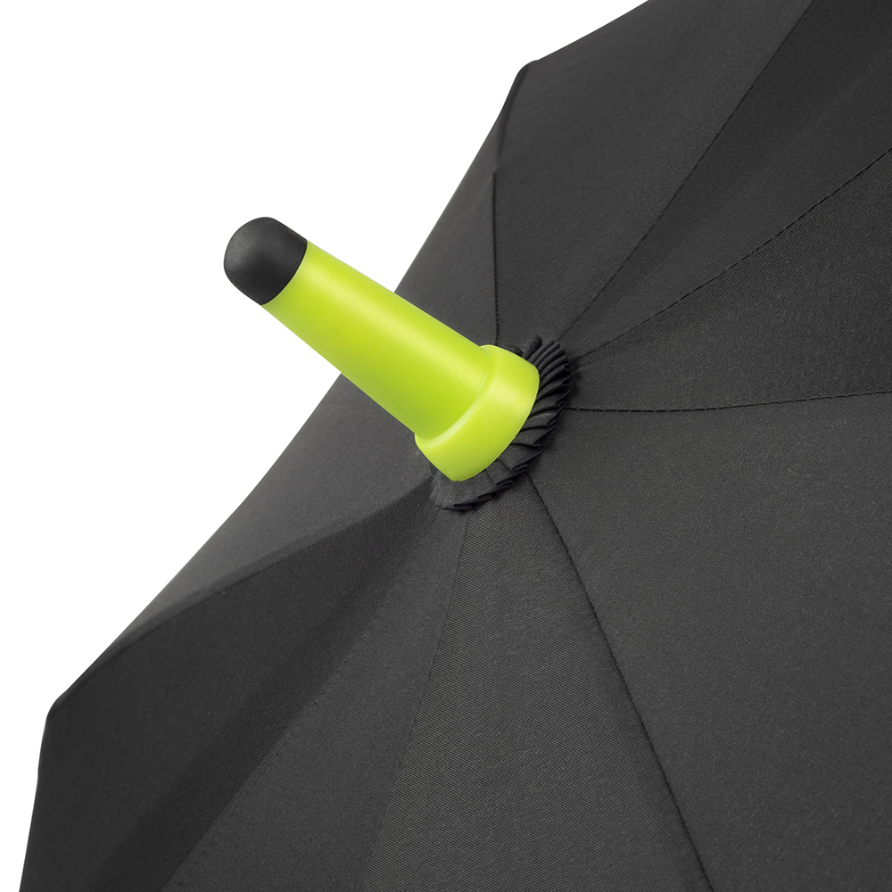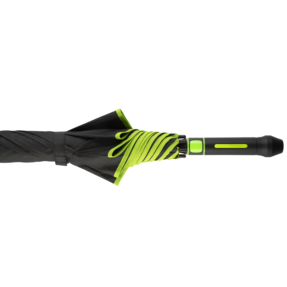 Der Regenschirm verfügt über eine Bespannung aus 190T Pongee mit farblicher Bordüre und einem Durchmesser von ca. 120 cm. Im geschlossenen Zustand ist er etwa 95 cm lang und lässt sich per Automatik öffnen. Der Schirm besteht aus 8 Segmenten und ist mit 68 cm langen Fiberglasspeichen sowie einem 14 mm Fiberglas-Schaft in der Farbe der Bespannung ausgestattet. Zudem bietet der Schirm eine Windproof-Funktion für zusätzliche Stabilität. Der schwarze, gummierte Kunststoffgriff kann mit seitlichem Doming veredelt werden und sorgt für einen komfortablen Halt.