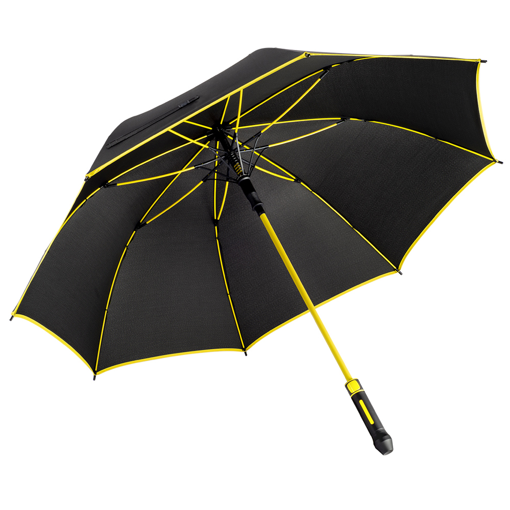 Der Regenschirm verfügt über eine Bespannung aus 190T Pongee mit farblicher Bordüre und einem Durchmesser von ca. 120 cm. Im geschlossenen Zustand ist er etwa 95 cm lang und lässt sich per Automatik öffnen. Der Schirm besteht aus 8 Segmenten und ist mit 68 cm langen Fiberglasspeichen sowie einem 14 mm Fiberglas-Schaft in der Farbe der Bespannung ausgestattet. Zudem bietet der Schirm eine Windproof-Funktion für zusätzliche Stabilität. Der schwarze, gummierte Kunststoffgriff kann mit seitlichem Doming veredelt werden und sorgt für einen komfortablen Halt.