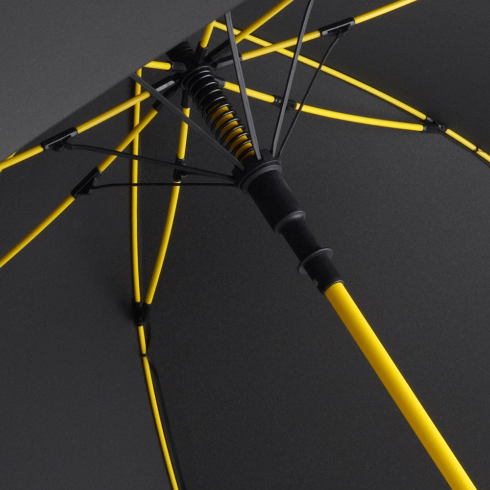 Komfortable Automatik-Funktion zum schnellen Öffnen, hochwertiges Windproof-PLUS-System für eine maximale Gestell-Flexibilität bei stärkeren Windböen, flexible Fiberglasschienen, stabiler Stahlstock mit farbiger Kunststoffummantelung, Polyester-Pongee Bezugsmaterial aus recycelten Kunststoffen, umweltfreundlich dank original waterSAVE Bezugsmaterial, mit waterSAVE®-Label auf dem Schließband (bei neuen Chargen), exklusiver gerader Soft-Feel-Griff mit farbigen Griffringen und doppelter Werbeanbringungsmöglichkeit. Auch als Taschenschirm (Art. 5084, 5484, 5584) und Midsize-Schirm (Art. 4784) erhältlich.