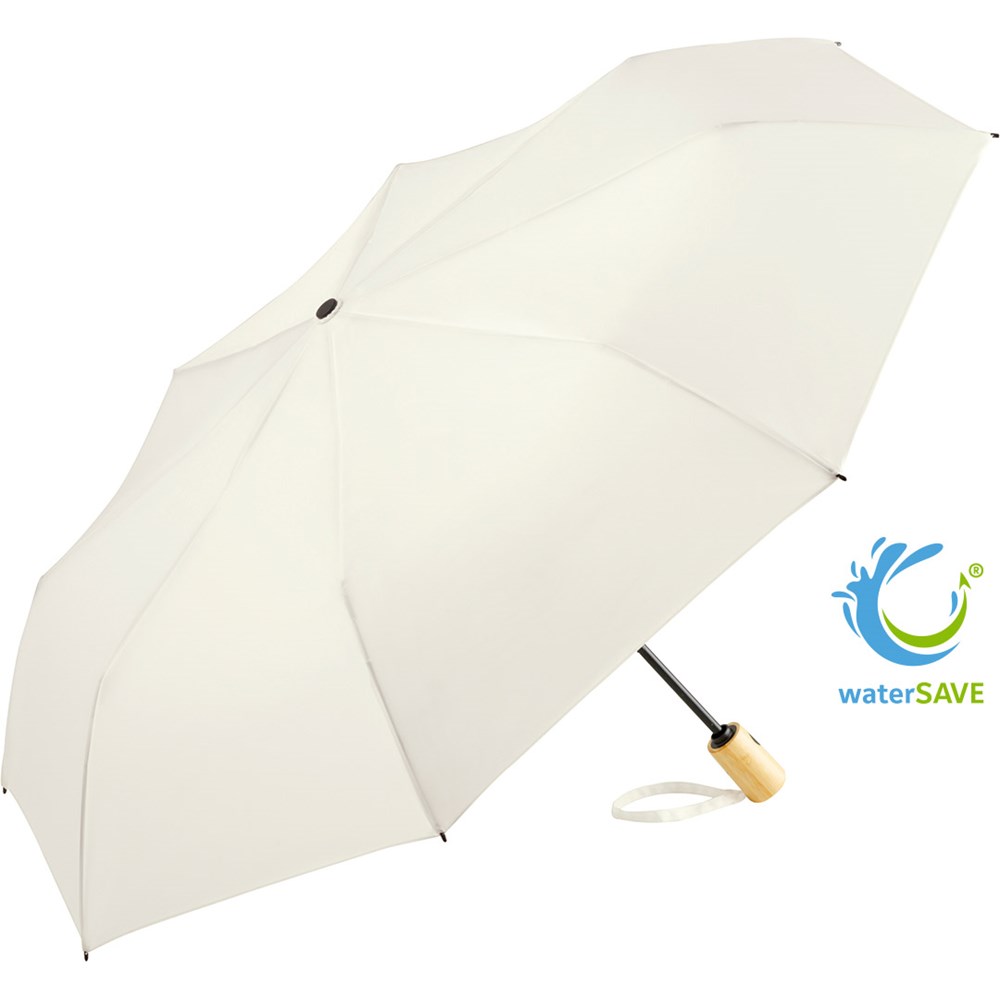 Komfortable Doppelautomatik-Funktion zum schnellen Öffnen und Schließen, hochwertiges Windproof-PLUS-System für eine maximale Gestell-Flexibilität bei stärkeren Windböen, Polyester-Pongee Bezugsmaterial aus recycelten Kunststoffen, farbabhängig auch mit waterSAVE® Bezugsmaterial erhältlich, mit waterSAVE®-Label auf dem Schließband (bei neuen Chargen), Bambusgriff mit schwarzer Auslösetaste und Werbeanbringungsmöglichkeit. Auch als Midsize-Schirm (Art. 7379) erhältlich.