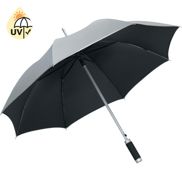 Stabiler Automatik-Stockschirm mit beschichtetem Außenbezug Komfortable Automatik-Funktion zum schnellen Öffnen, hochwertiges Windproof-PLUS-System für eine maximale Gestell-Flexibilität bei stärkeren Windböen, flexible Fiberglasschienen, leichter aber stabiler Aluminiumstock, von außen beschichteter Bezug, alufarbener Griff mit schwarzem Soft-Material und Werbeanbringungsmöglichkeit