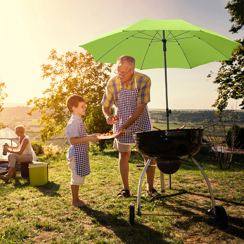 Einfache Handhabung durch Sicherheitsschieber, sehr stabile Fiberglasschienen, zweiteiliger und stufenlos höhenverstellbarer Stock mit Knickvorrichtung zur Neigung des Schirms, Schienen und Stock in edlem Titan-Finish, Unterstock mit ca. 125 cm Länge und Drehfeststeller zur sicheren Fixierung, komfortables Tragefutteral, hochqualitativer Bezug mit einer Grammatur von ca. 200 g/m² und Lichtschutzfaktor UPF 50+, überlappender Ventilationsbezug zur Regulierung von Überdruck durch stärkere Windböen, exklusive Füllständer (Art. 8920)