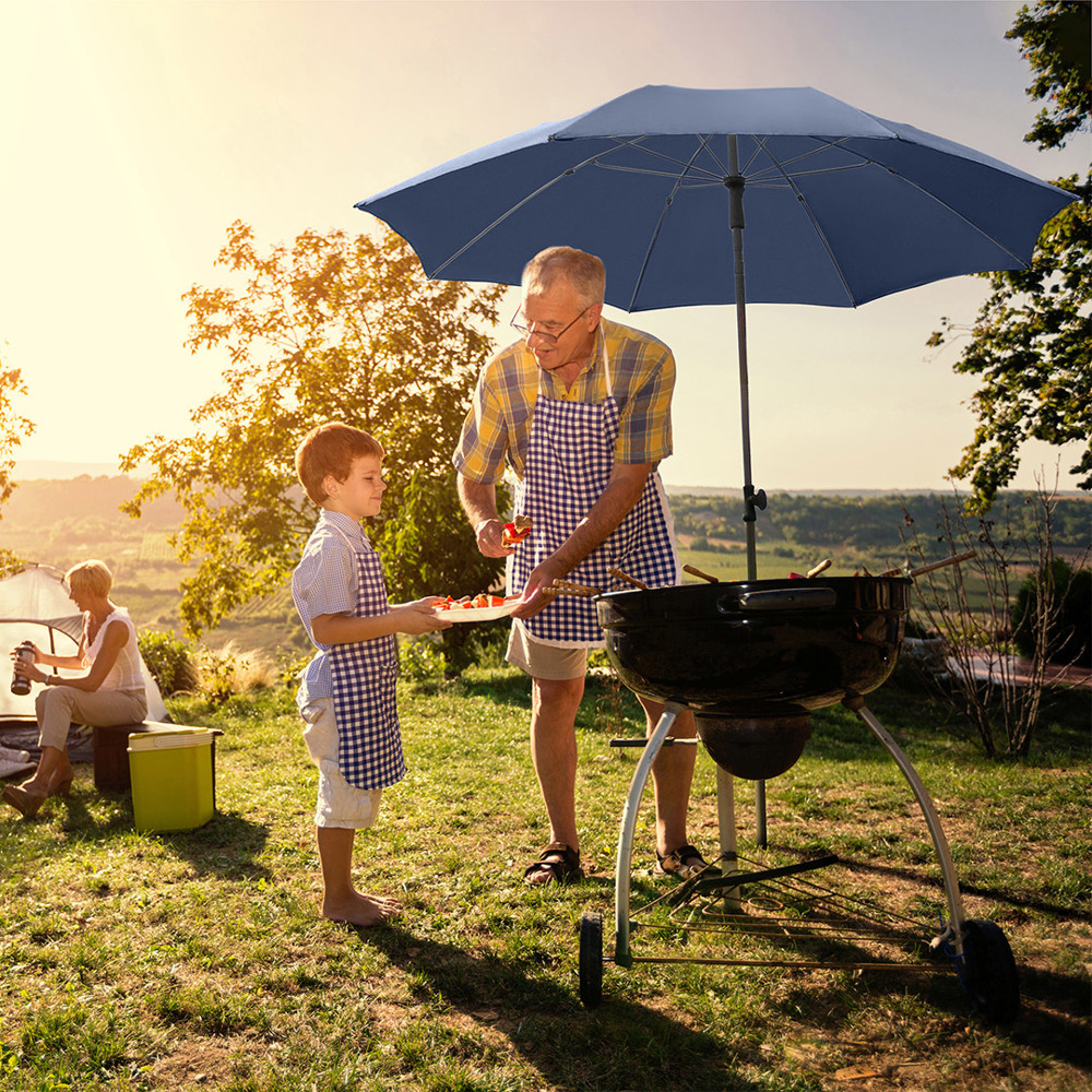 Einfache Handhabung durch Sicherheitsschieber, sehr stabile Fiberglasschienen, zweiteiliger und stufenlos höhenverstellbarer Stock mit Knickvorrichtung zur Neigung des Schirms, Schienen und Stock in edlem Titan-Finish, Unterstock mit ca. 125 cm Länge und Drehfeststeller zur sicheren Fixierung, komfortables Tragefutteral, hochqualitativer Bezug mit einer Grammatur von ca. 200 g/m² und Lichtschutzfaktor UPF 50+, überlappender Ventilationsbezug zur Regulierung von Überdruck durch stärkere Windböen, exklusive Füllständer (Art. 8920)