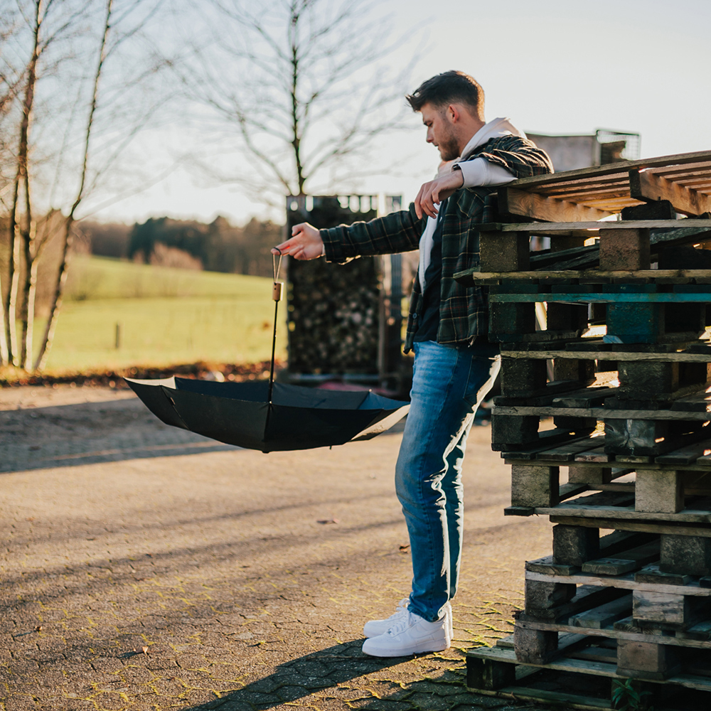 Dieser Taschenschirm hat eine geschlossene Länge von ca. 30 cm und lässt sich dank der Doppelautomatik schnell öffnen. Er verfügt über 8 Segmente und 53 cm lange Metall-Fiberglasspeichen für zusätzliche Flexibilität und Stabilität. Der dreiteilige schwarze Metallschaft sorgt für Langlebigkeit und Robustheit. Ausgestattet mit einer Windproof-Funktion ist dieser Schirm besonders widerstandsfähig gegen starke Winde. Der Holzgriff mit Trageschlaufe bietet eine komfortable Handhabung und einfachen Transport.