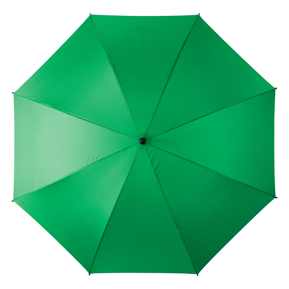 Dieser Regenschirm aus 190T RPET-Pongee hat einen Durchmesser von ca. 130 cm. Mit einer geschlossenen Länge von ca. 101 cm lässt er sich dank des Automatikmechanismus schnell öffnen. Der Schirm verfügt über 8 stabile Segmente, schwarze 65 cm lange Fiberglasspeichen und einen robusten 14 mm Fiberglasschaft. Der gebogene Rundgriff mit PU-Beschichtung in Schwarz sorgt für einen komfortablen Halt.