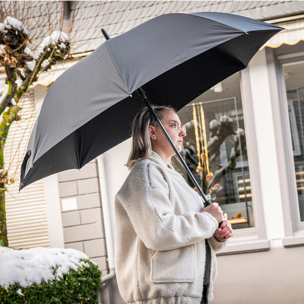 Dieser Automatikschirm hat eine geschlossene Länge von ca. 101 cm und öffnet sich mit einem praktischen Automatikmechanismus. Er verfügt über 8 stabile Segmente und schwarze Fiberglasspeichen mit einer Länge von 75 cm. Der gerade Griff mit PU-Beschichtung ist farblich auf die Bespannung abgestimmt. Inklusive praktischer Tragehülle für einfachen Transport.