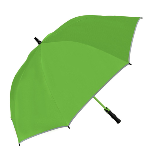 Der Gasschirm hat eine Länge von ca. 93 cm (geschlossen) und lässt sich automatisch öffnen. Er besteht aus 8 Segmenten und einem 14 mm Fiberglasschaft in der Farbe der Bespannung. Mit 68 cm langen Doppel-Fiberglasspeichen in der gleichen Farbe wie die Bespannung bietet der Schirm hohe Stabilität. Ausgestattet mit einer Windproof-Funktion trotzt er auch stärkeren Winden. Der PU-beschichtete, gerade Handgriff mit Farbakzenten in der Farbe der Bespannung sorgt für einen komfortablen Halt. Eine Doming-Veredelung im Griff ist möglich.