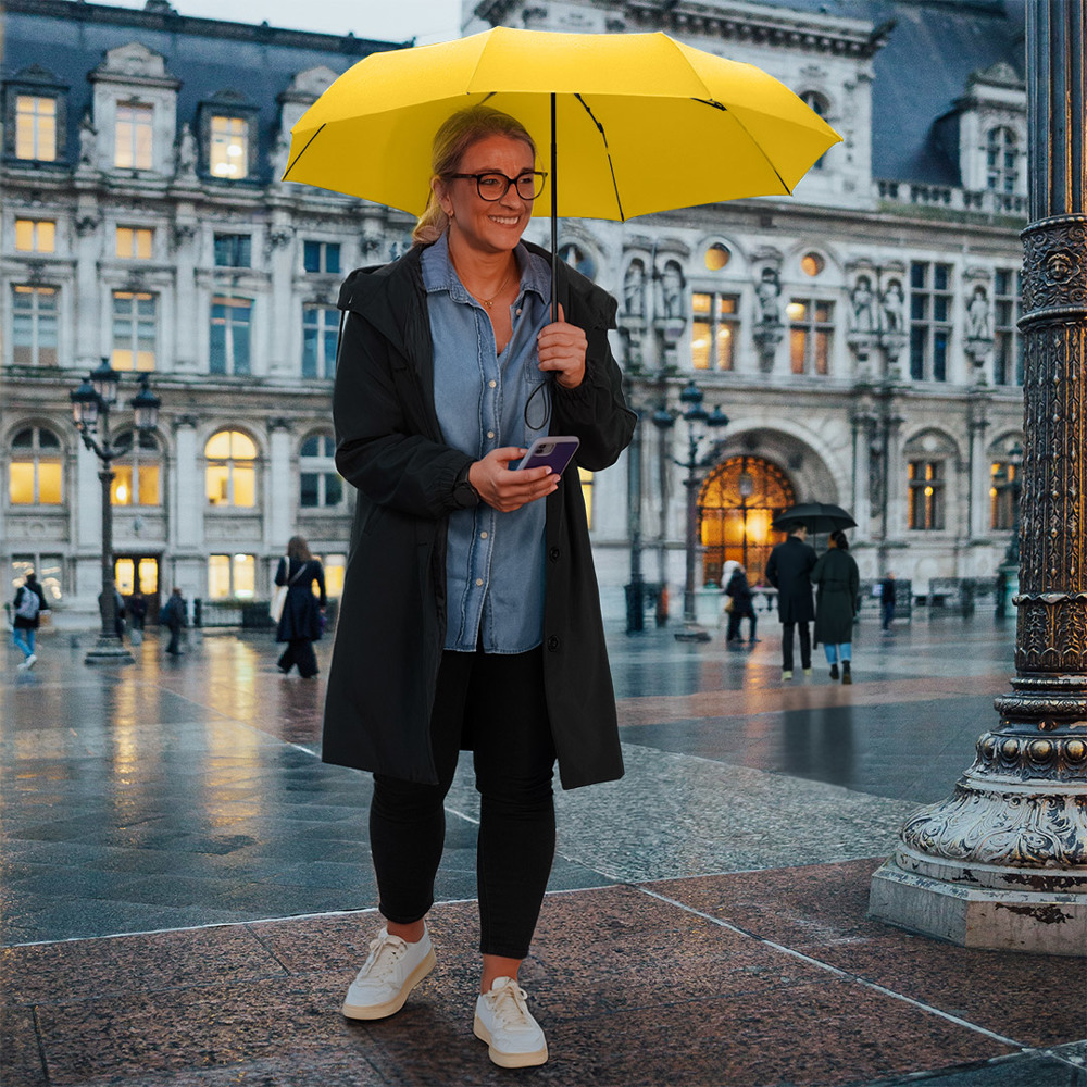 Kompakter Handöffner-Taschenschirm mit hervorragendem Preis-Leistungs-Verhältnis und Windproof-PLUS-System Einfache Handhabung durch Sicherheitsschieber, hochwertiges Windproof-PLUS-System für eine maximale Gestell-Flexibilität bei stärkeren Windböen, Soft-Feel-Griff mit elastischer Tragekordel und Werbeanbringungsmöglichkeit