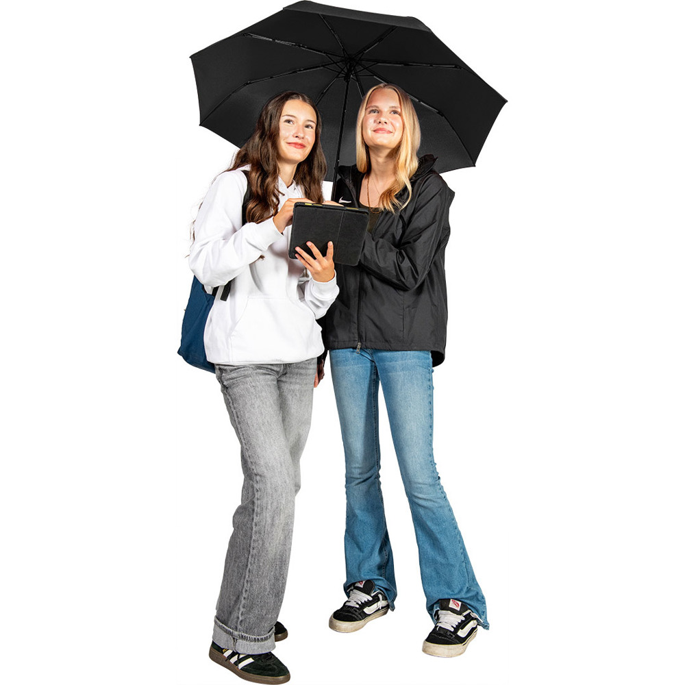 Kompakter Handöffner-Taschenschirm mit hervorragendem Preis-Leistungs-Verhältnis und Windproof-PLUS-System Einfache Handhabung durch Sicherheitsschieber, hochwertiges Windproof-PLUS-System für eine maximale Gestell-Flexibilität bei stärkeren Windböen, Soft-Feel-Griff mit elastischer Tragekordel und Werbeanbringungsmöglichkeit