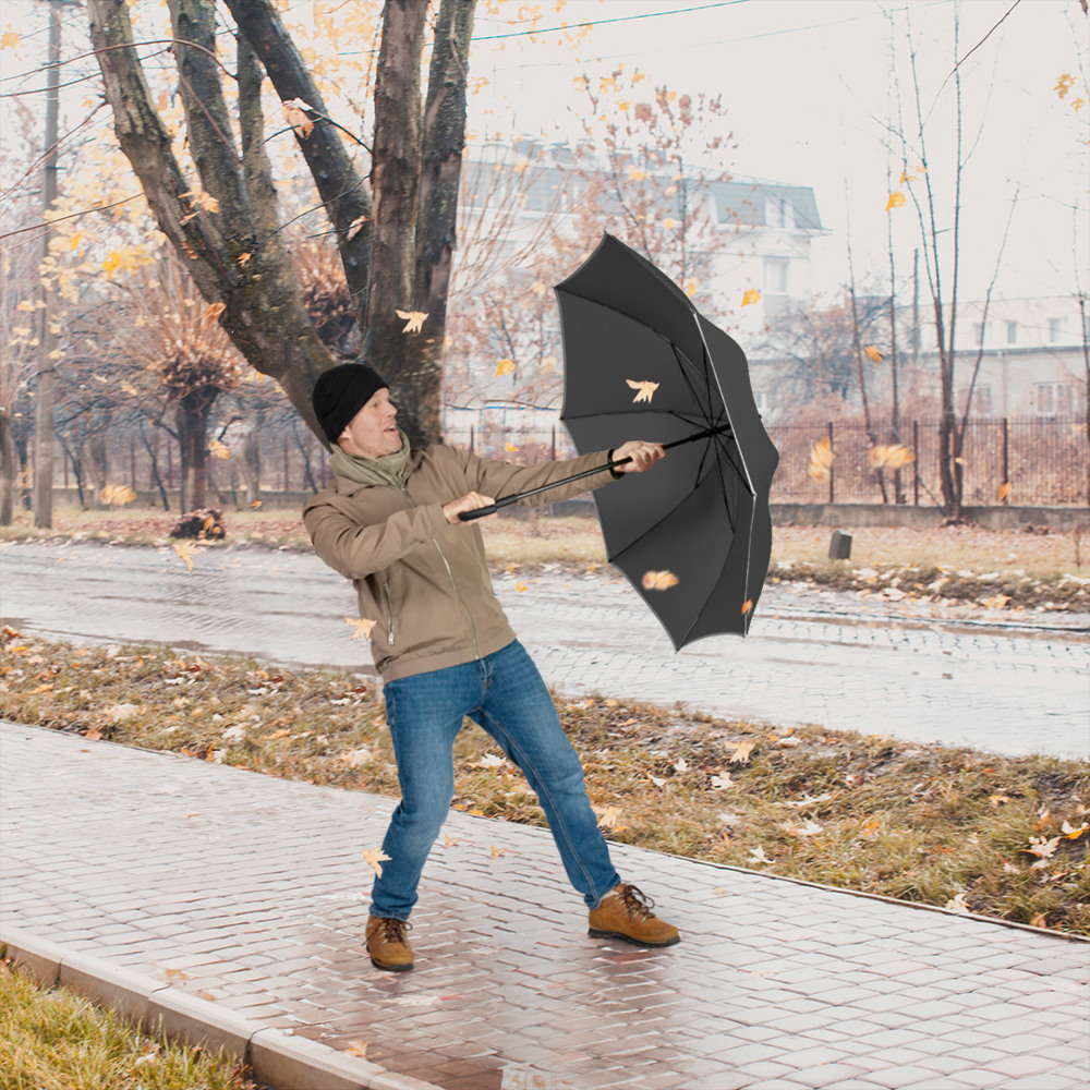 Smarter Stockschirm in mittlerer Größe mit modisch reflektierender Paspelierung Komfortable Automatik-Funktion zum schnellen Öffnen, hochwertiges Windproof-PLUS-System für eine maximale Gestell-Flexibilität bei stärkeren Windböen, flexible Fiberglasschienen, stabiler Stahlstock schwarz galvanisiert, Bezug mit modischer Reflexpaspel in Silber, Polyester-Pongee Bezugsmaterial aus recycelten Kunststoffen, umweltfreundlich dank original waterSAVE® Bezugsmaterial, mit waterSAVE®-Label auf dem Schließband, Soft-Feel-Rundhakengriff mit Werbeanbringungsmöglichkeit