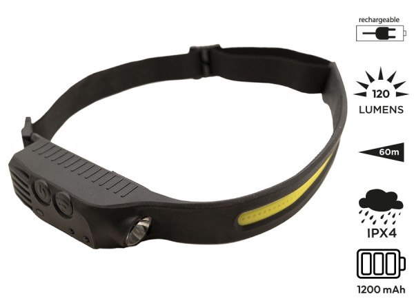 4 Beleuchtungsmodi: XPE-LED (100 % oder 'Eco'-Modus) und weißes COB (100 % oder 'Eco'-Modus). Integrierter Bewegungssensor für berührungsloses Ein- und Ausschalten. Gehäuse aus ABS-Kunststoff und Silikon. Bequemes elastisches Stirnband aus Soft-Touch und Silikon. Funktioniert mit einem 1200-mAh-Akku. Wird mit einem USB-C-Kabel geliefert. XPE-LED-Leistung: 3 W (80 Lumen). XPE-LED-Strahllänge: 60 m. XPE-LED Autonomie: 5h-5,5h. COB-Leistung: 3W (120 Lumen). COB-Strahllänge: 30 m. COB Autonomie: 2h. Wasserdichtigkeitsgrad: IPX-4.
